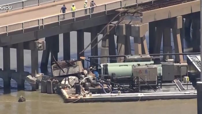 It looks like the barge hit well away from where the channel goes under the bridge. Loss of power likely.